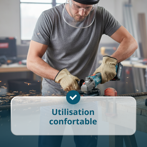 • Utilisation sûre – le système de protection comprend : protection contre la surchauffe, la surcharge et la décharge excessive de la batterie ; de plus, la meuleuse d’angle dispose d’un carter de protection double face avec anti-rotation et d’un système de blocage d’engrenage sans outil pour la sécurité de l’utilisateur pendant le travail.