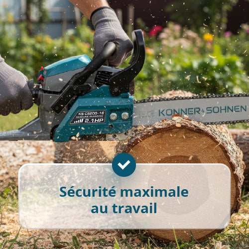 • Sécurité maximale lors du travail – le frein à inertie de la chaîne arrête instantanément la chaîne en cas de rebond, réduisant le risque de blessure et permettant de travailler en toute confiance, même sous forte charge.