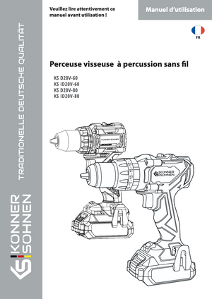 | Composants* | Perceuse à percussion sans fil KS ID20V-80, Visseuse à choc sans fil KS ISD20V-260-4, Chargeur de batteries 20V KS C24A, 2×20V 2Ah Batterie lithium, Manuel |