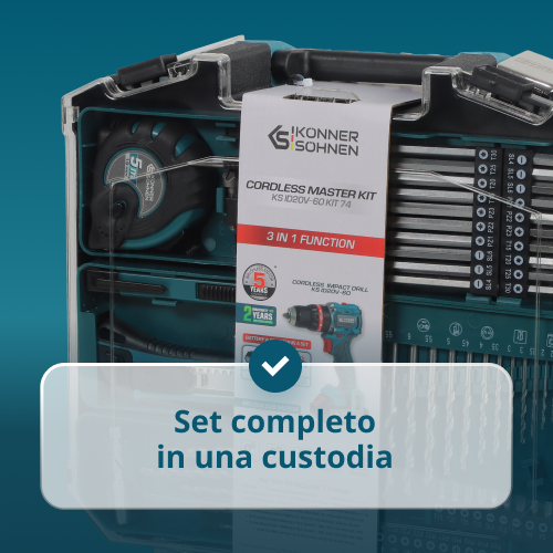 • Set completo in valigetta – tutto il necessario per il lavoro è incluso: trapano, batteria da 2 Ah, caricabatterie da 2.4 A e un set di 74 accessori — inserti, punte e adattatori, tutto comodamente disposto nella valigetta, semplificando lo stoccaggio, il trasporto e rendendo il trapano pronto all’uso subito dopo l’apertura.