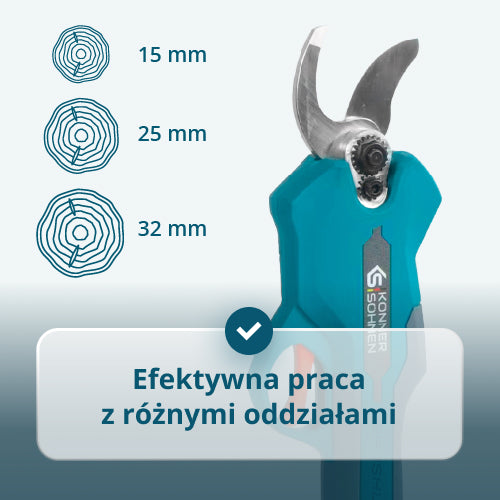 • Efektywna praca z różnymi gałęziami – trzy tryby otwarcia ostrzy (15, 25, 32 mm) pozwalają szybko dopasować się do dowolnej grubości, oszczędzić czas i zmniejszyć zużycie energii.