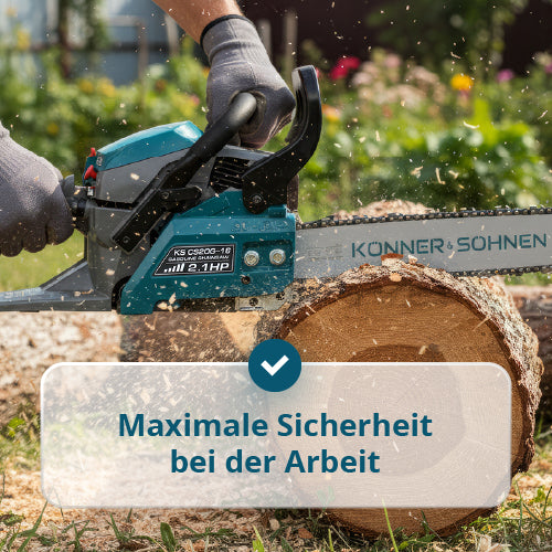 • Maximale Sicherheit bei der Arbeit – die Trägheitskettenbremse stoppt die Kette sofort bei einem Rückschlag, verringert das Verletzungsrisiko und ermöglicht sicheres Arbeiten auch bei hoher Belastung.