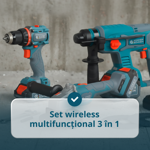 • Set multifuncțional fără fir 3in1 cu geantă practică – trei unelte într-un singur set: ciocan rotopercutor, șlefuitor unghiular, perforator cu 2 baterii și încărcător rapid într-o geantă comodă pentru diverse sarcini de uz casnic.