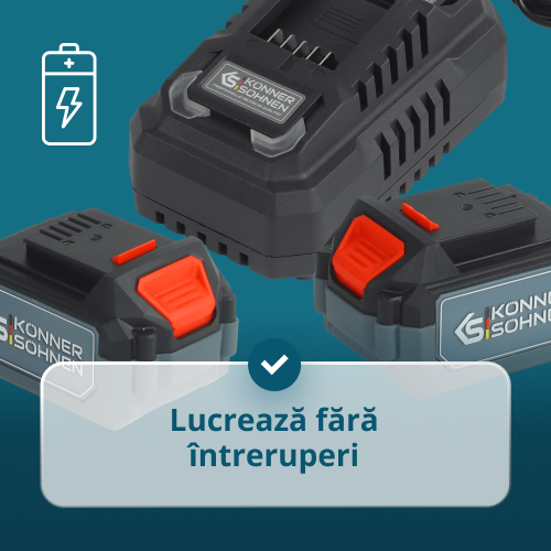• Lucru continuu – Prezența a două baterii de 4.0 Ah și a unui încărcător rapid de 4.5 A în set permite încărcarea uneia în timp ce lucrezi cu cealaltă.