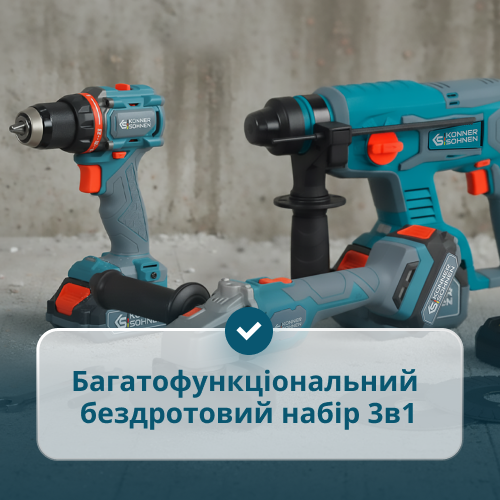 • Багатофункціональний бездротовий набір 3в1 у зручній сумці – три інструменти в одному наборі:  дриль, кутова шліфувальна машина, перфоратор з 2 акумуляторами та швидким зарядним пристроєм у зручній сумці для різних побутових завдань.