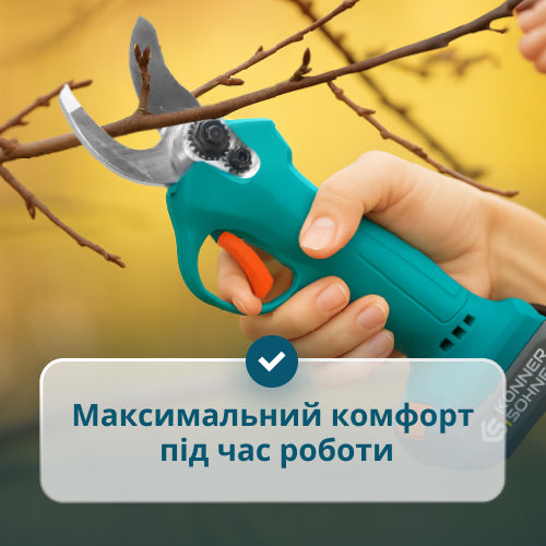 | Комплектація | Акумуляторний секатор, гільза ключа, ключ, захисний чохол для леза, точильний камінь, пляшка для оливи, зарядний пристрій 20В 2,4А, акумулятор літієвий 20В 2А·год, інструкція |